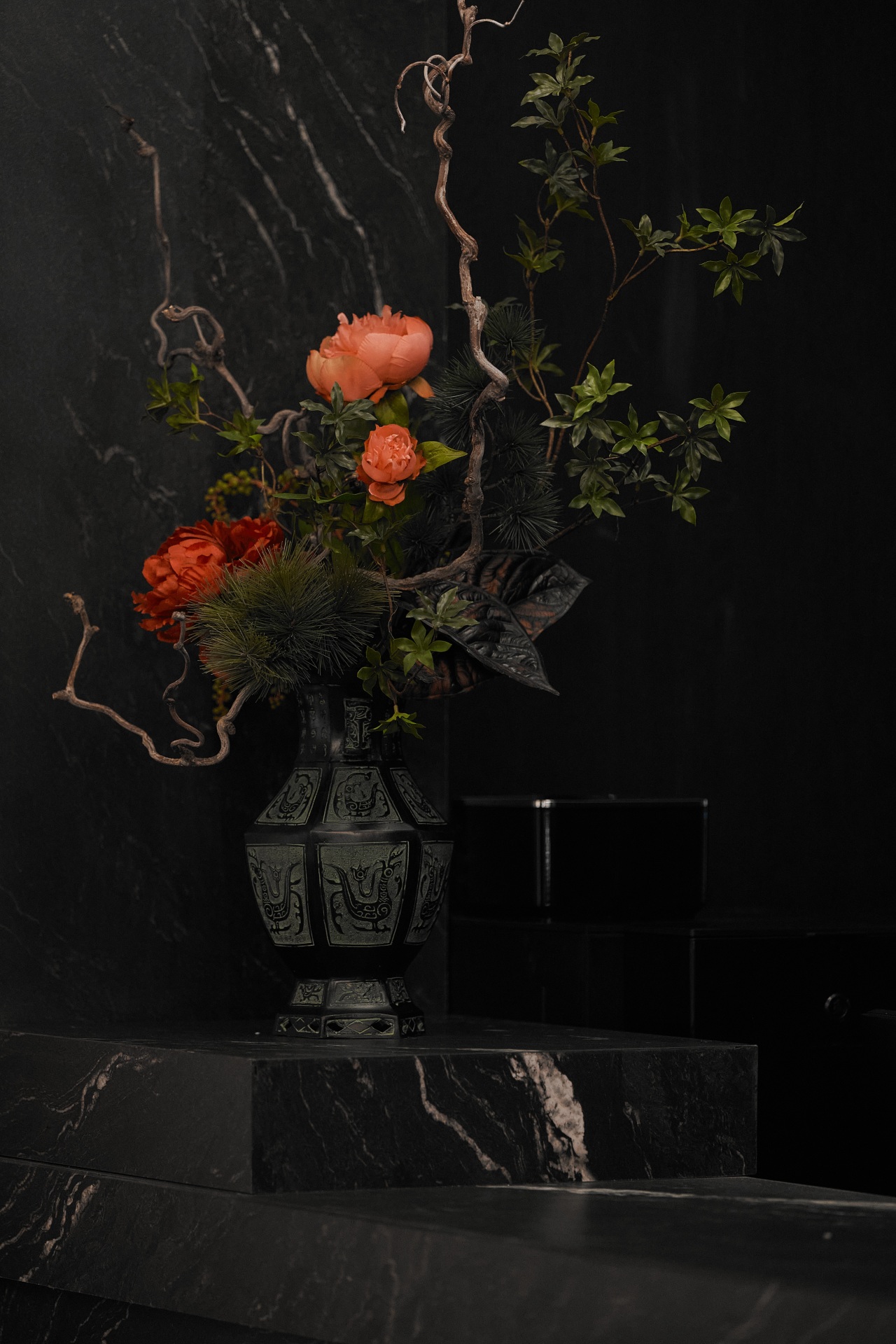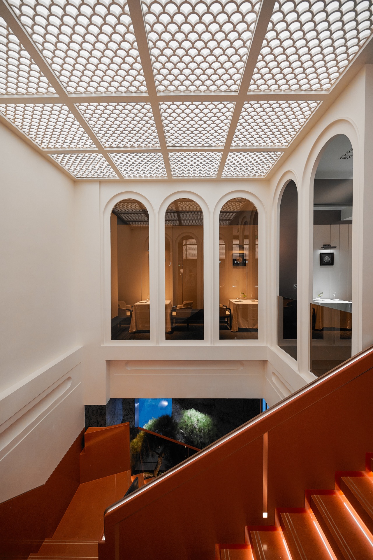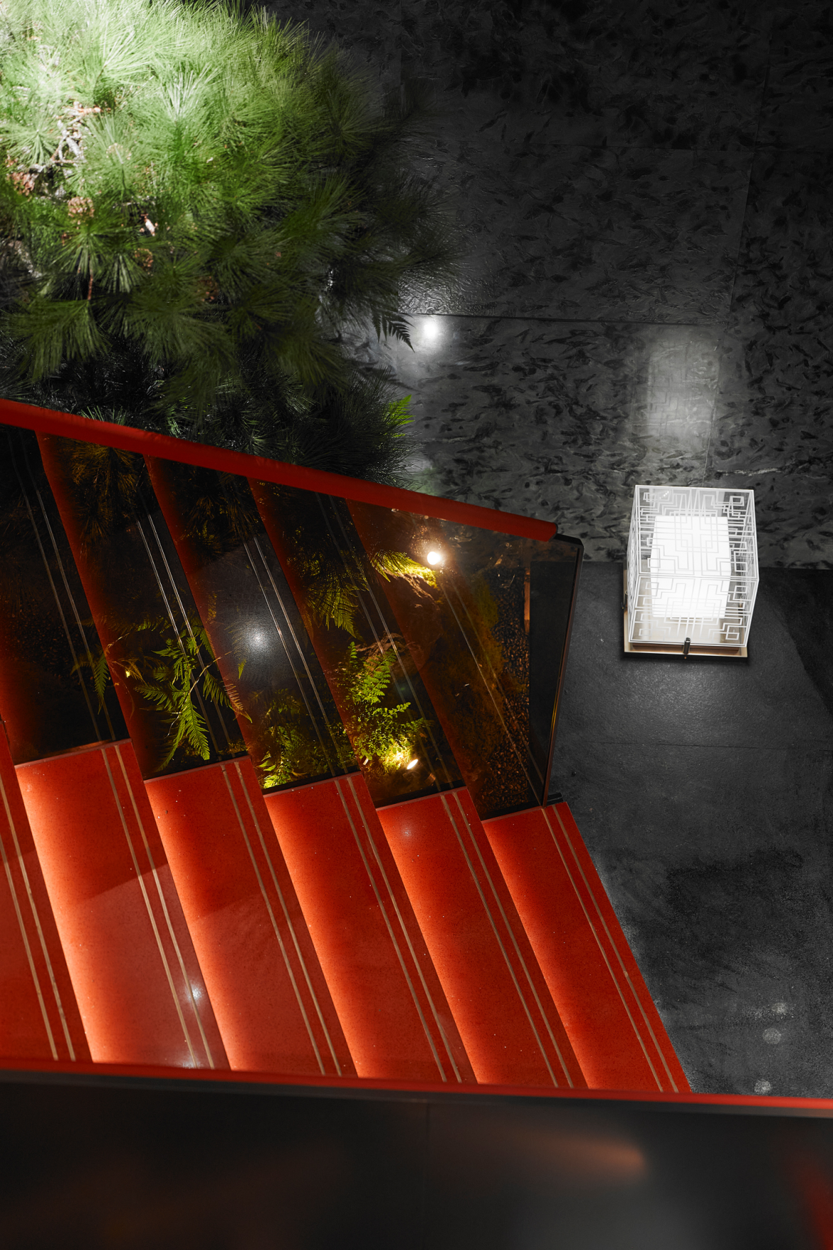 一楼空间,黑红配色的楼梯如墨色长卷上一抹绛鳞红点睛,将东方美学的沉稳与热烈巧妙融合。梯侧的迎客松以古松之姿,苍劲挺拔,以千年迎客之礼,真诚地迎接每位顾客的到来。