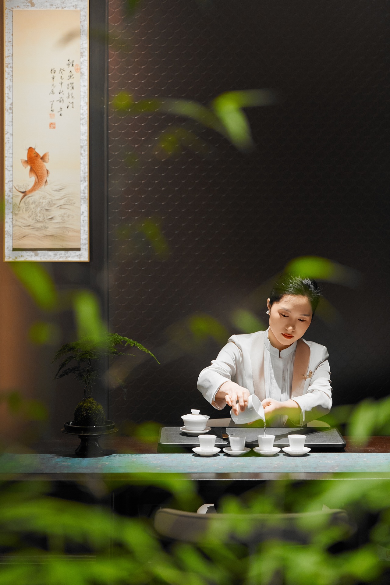 指尖捻起一抹清茗雅韵,氤氲茶香漫过席间,中式风雅相映成趣;