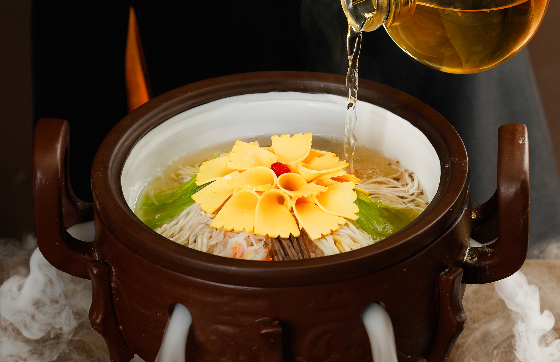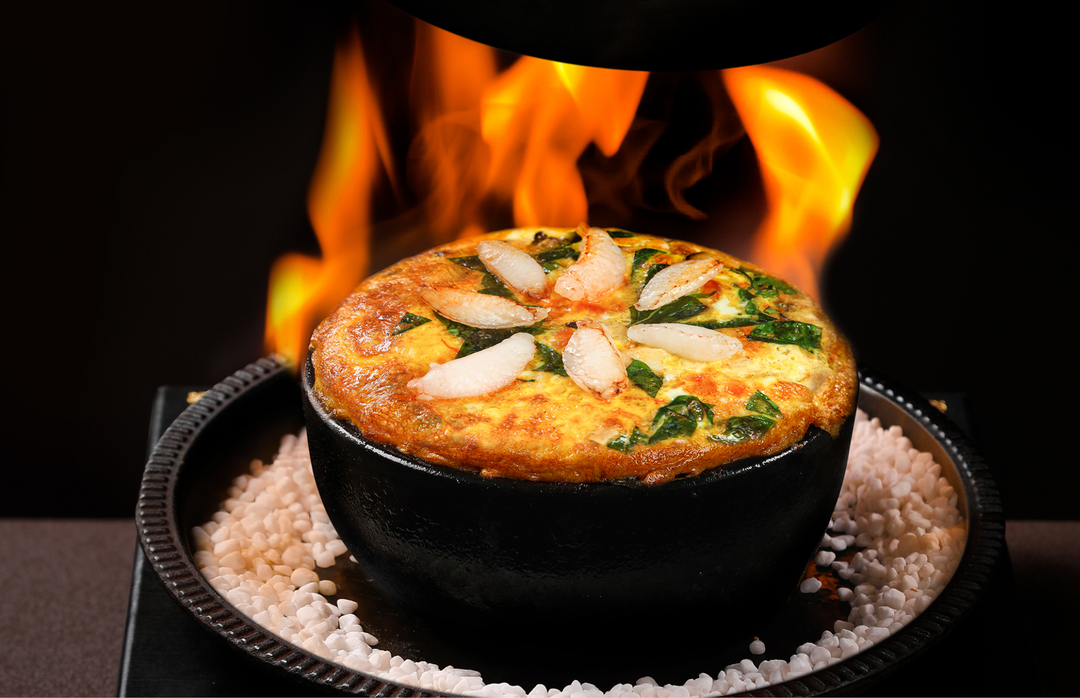 以卢氏生态绿皮鸡蛋为基底的三鲜铁锅蛋,融入蟹肉、海参、鲜虾仁与荆芥等食材,色泽金黄,香气四溢。