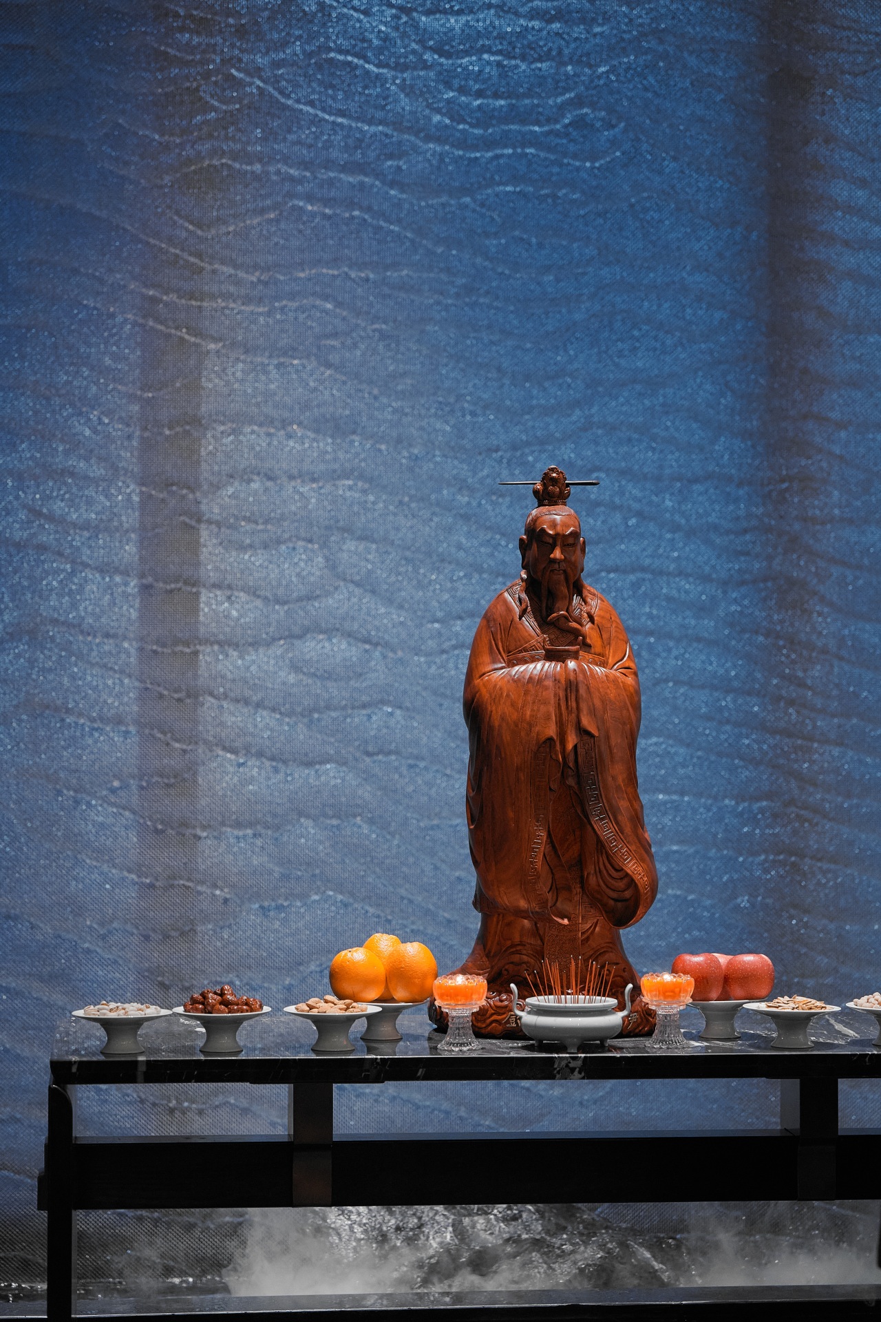 非遗传承人、木雕大师精选老料千年红木手工雕刻的“厨祖”伊尹像,历时100多天精雕细刻,是厨师匠心的象征和精神引领。