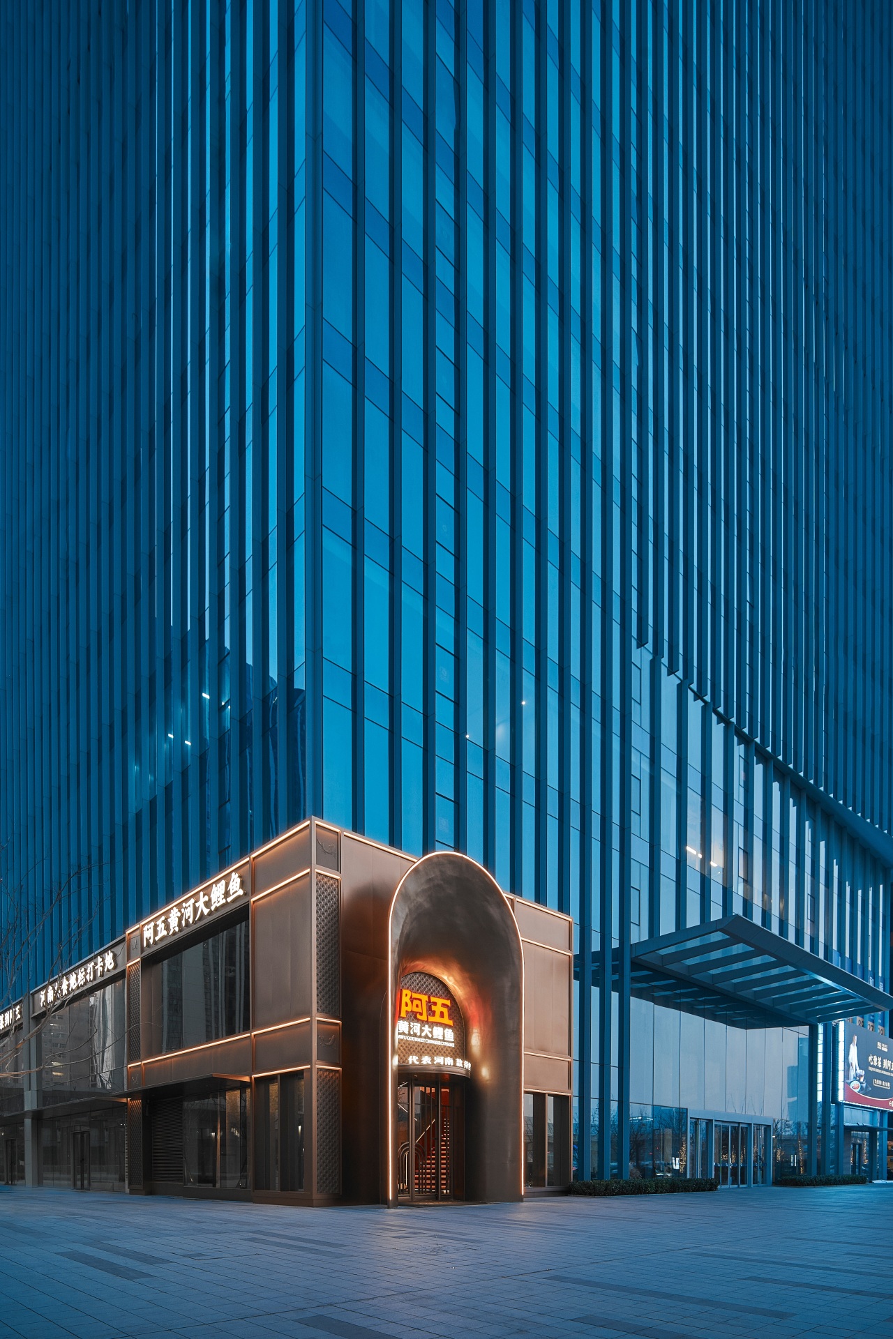 门头采用大气磅礴的拱形金属门设计,巧妙融入鱼鳞文化与鼎文化符号——鱼鳞呼应阿五标志性的黄河鲤鱼,鼎则彰显中原作为华夏腹地的厚重底蕴,一进门便将河南文化的辨识度拉满。