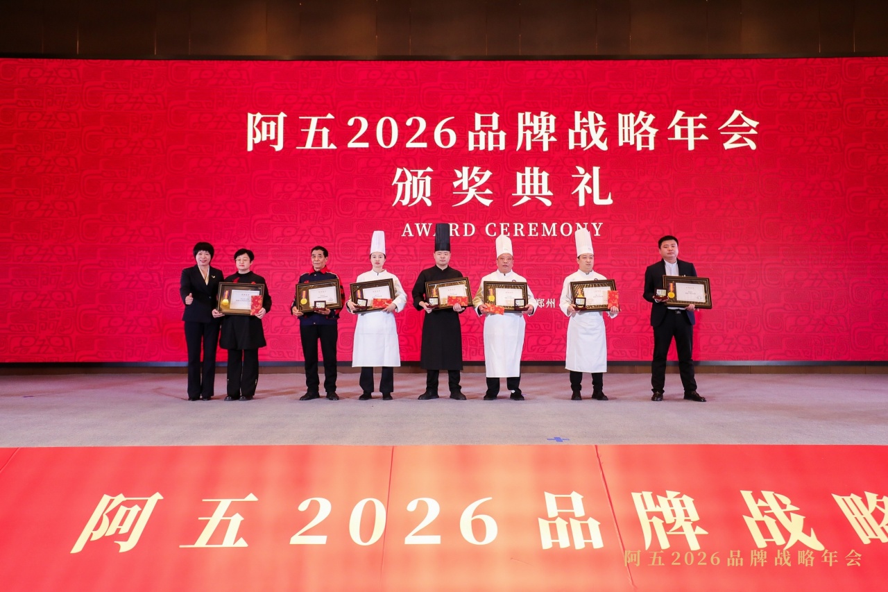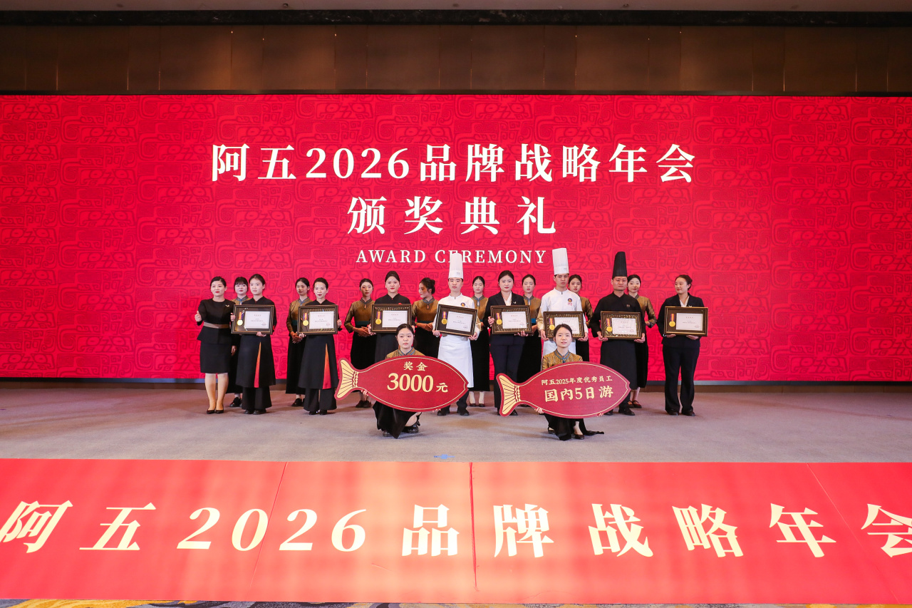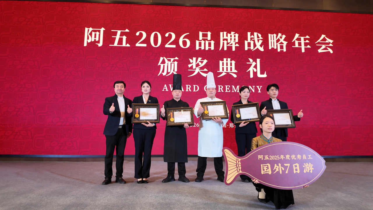 2026年1月12日,阿五品牌战略年会暨合作伙伴年会在郑州隆重召开。现场颁发2025年度“优秀员工”“优秀店长”“十年忠诚奖”“服务之星”“厨艺匠心”“优秀厨师长”“卓越团队”等10余项大奖。