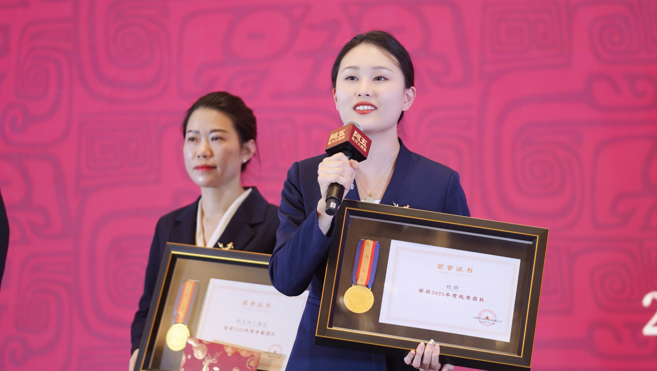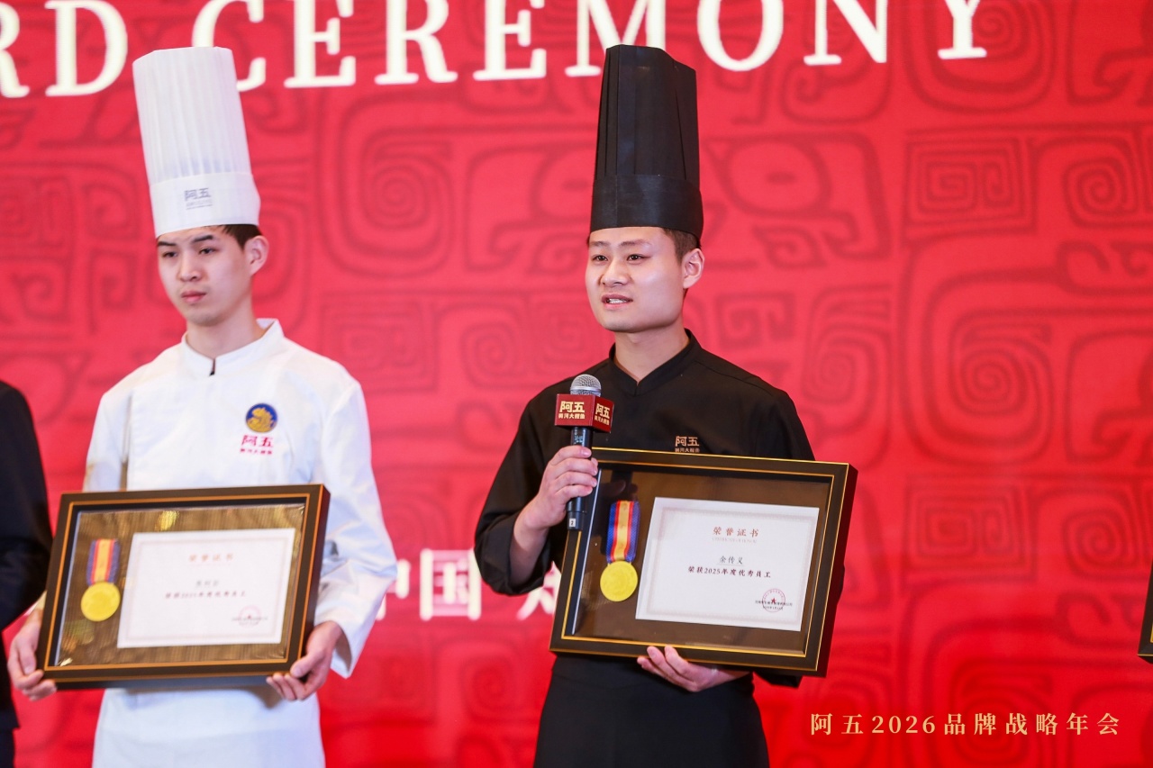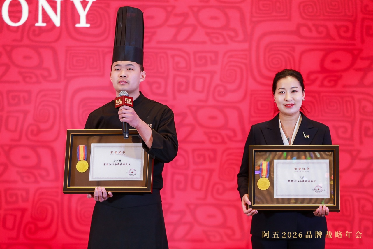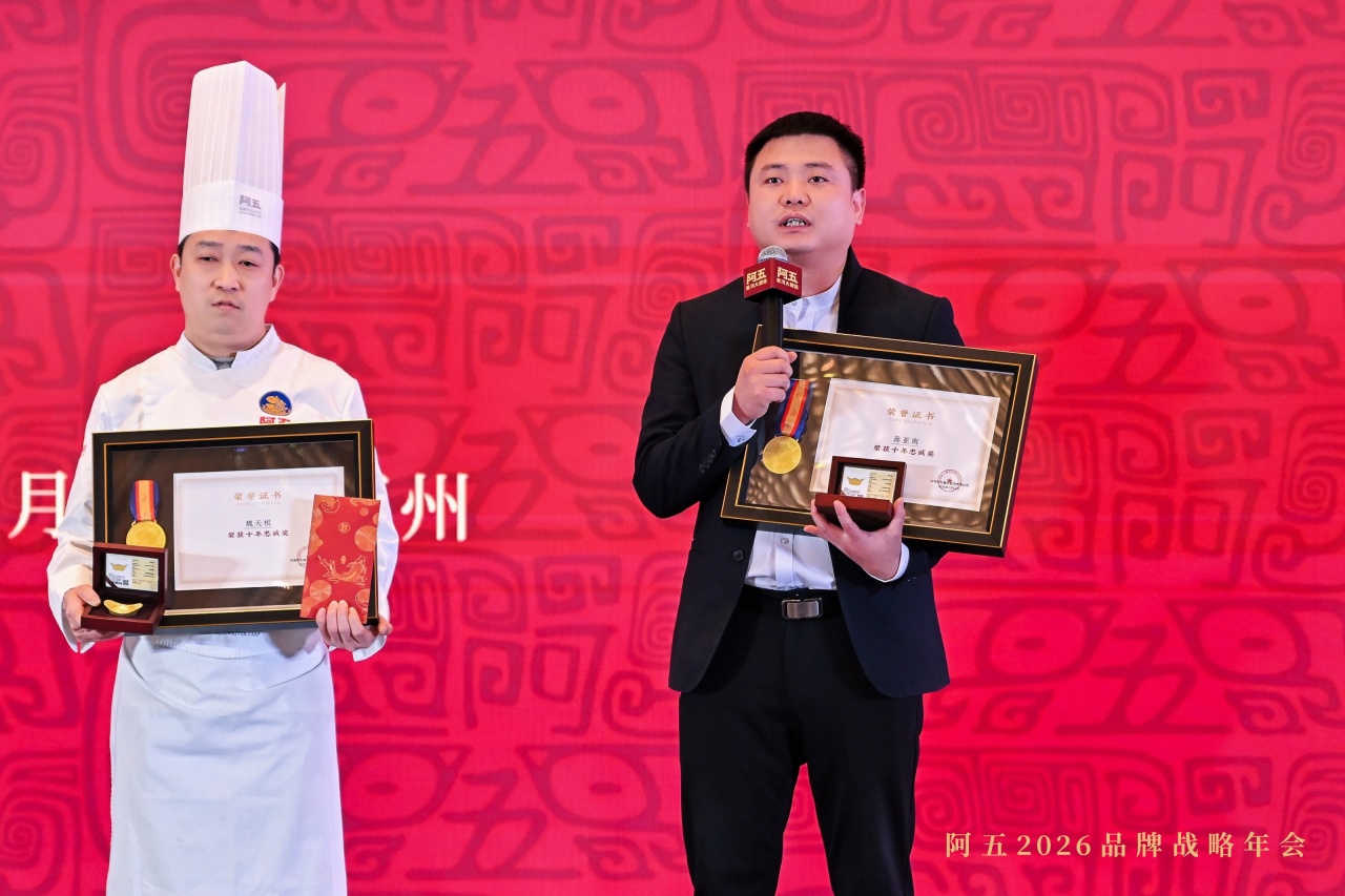 2026年1月12日,阿五品牌战略年会暨合作伙伴年会在郑州隆重召开。现场颁发2025年度“优秀员工”“优秀店长”“十年忠诚奖”“服务之星”“厨艺匠心”“优秀厨师长”“卓越团队”等10余项大奖。